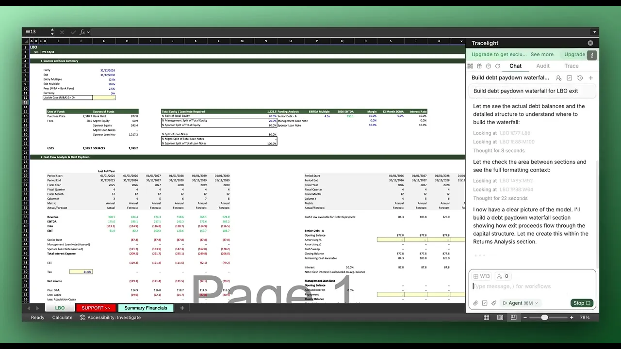 A: Yes. Tracelight reads your existing LBO financial model and builds an exit proceeds waterfall directly in your spreadsheet, sequencing debt tranches correctly and validating the distribution logic, all from a plain-English prompt.