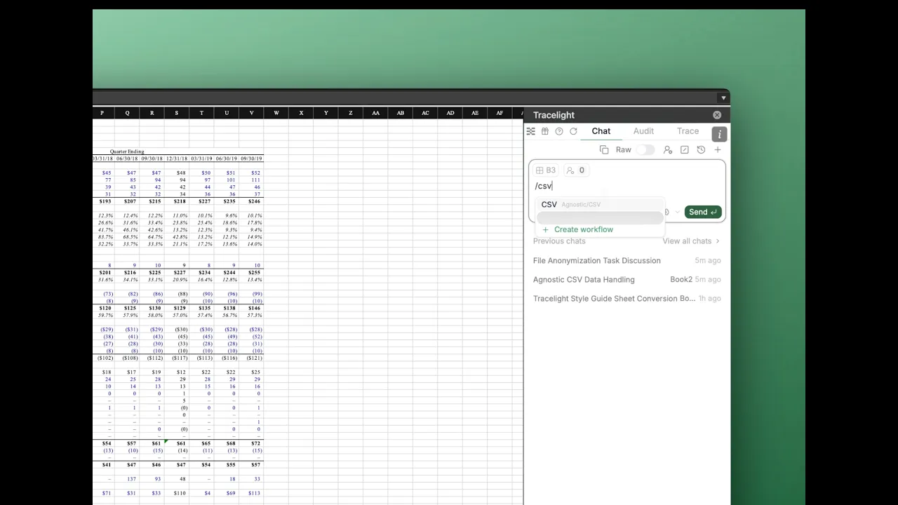 You tell the agent to turn the model into a CSV according to your specifications in a tailored saved workflow, and Tracelight's AI for financial modelling builds what you need: a flat CSV with one row per metric-period combination, formula-linked to the source sheet. Tracelight reads the model structure, maps every row and column intersection, and builds the output directly in a new tab, without touching the source data.