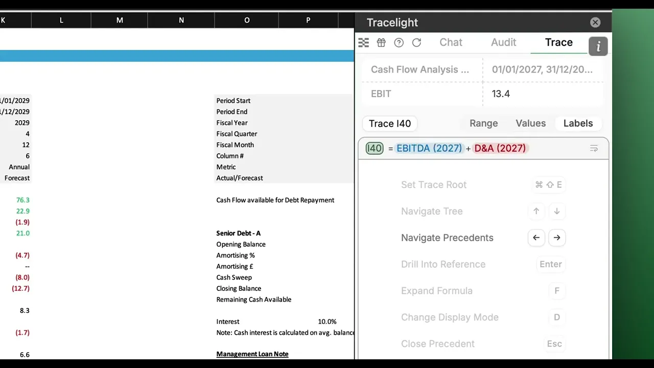 Tracelight's Trace feature maps the full precedent tree for any selected range in a single, navigable panel linked directly to your workbook.